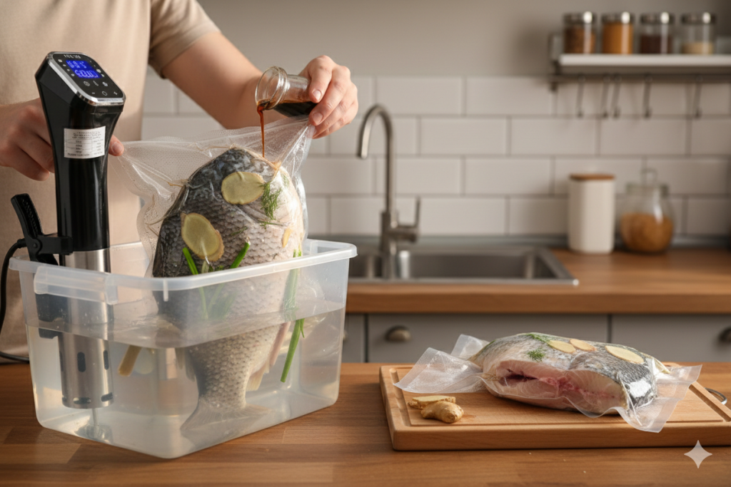 Phương pháp Sous Vide giúp thực phẩm chín đều ở nhiệt độ chính xác trong môi trường chân không.